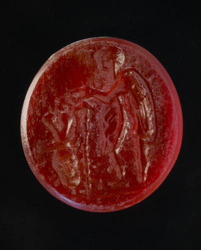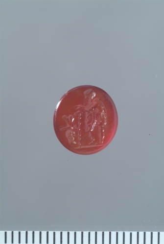 Nella corniola è raffigurato un personaggio maschile, forse vestito con un mantello, stante sulla linea del suolo di profilo verso sinistra. La gamba portante di sinistra è tesa, la destra leggermente piegata; le braccia, allungate in avanti, si appoggiano con entrambe le mani sul bastone puntato al suolo (da notare la caratterizzazione a piccole perle); la testa è forse barbata e calva. Davanti alla figura (che recupera, seppure con qualche variante, l'iconografia del pastore/Faustolo) si trova un oggetto di difficile identificazione: una sorta di vaso da cui escono due elementi allungati con l'estremità tondeggiante (difficile pensare alla cista priapica con i serpenti, per cui si rimanda a Sena Chiesa 1966, pp. 295-296)