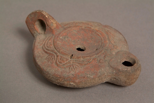 serbatoio ampio e schiacciato, becco tondo a profilo cuoriforme, ampia spalla pendente decorata a rilievo da una corona di tralci e viticci e separata dal disco, concavo, da due solci incisi