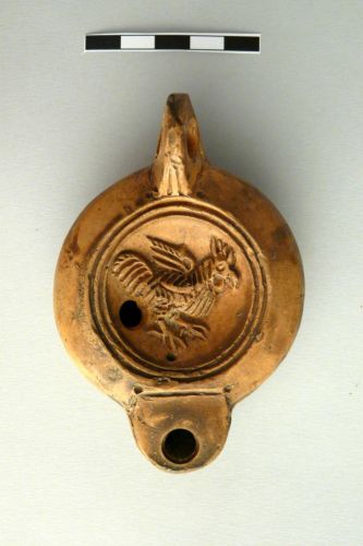 serbatoio troncoconico appiattito, ansa verticale a sezione quadrangolare con due scanalature, spalla pendente verso l'esterno; becco rotondo inserito leggermente a metà della spalla e separato dal disco da una linea retta orizzontale conclusa da due punti impressi; fondo circolare piatto profilato da una solcatura; nel disco, concavo e delimitato da due solcature nettamente incise, è raffigurato a rilievo un gallo volto a destra, vivamente impresso