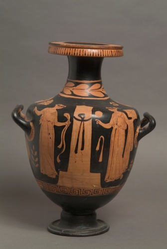 - NOTIZIE STORICO CRITICHE Si tratta di una probabile scena di omaggio alla stele del defunto, secondo un uso frequente su hydrie apule dal III° venticinquennio del IV sec.a.C., caratterizzate da una notevole affinità stilistica nella raffigurazione delle figure femminili.