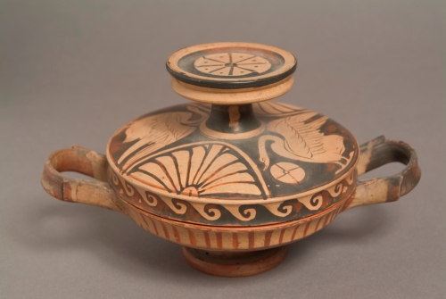 Lekanìs completa di coperchio, sull'orlo presenta una finta costolatura e due ingrossamenti ad alette sulle anse sembrano derivare dai tipi in metallo. Decorazione accurata ed elegante. Sul pomello del coperchio sono dei raggi alternati a punti; sul coperchio due cigni ad ali spiegate tra palmette a ventaglio incorniciate; sull'orlo del coperchio è un motivo ad onda e nella zona tra le anse dei trattini verticali.
