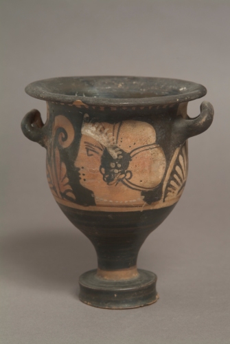 Labbro estroflesso, corpo allungato rastermato in basso, alto piede modanato, anse a bastoncello cilindrico ripiegate verso l'alto. Decorazione in A: profilo femminile a sinistra, con sakkos ricamato a filo di puntini, stephane radiata, orecchino formato da tre perle, posto sopra al ciuffo di capelli che copre le orecchie, collana di perle. Stephane, orecchino e collana sono a vernice bianca. Il volto è inquadrato da palmette a pettine e da girali; in B. idem. Decorazione accessoria: sotto l'orlo pennellate verticali; sotto le anse palmette a ventaglio.
