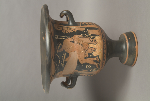 - NOTIZIE STORICO CRITICHE Attribuito al Pittore di Napoli 2585 per la presenza di alcuni motivi-firma: palmette triangolari ornate al centro da un punto e il bordo del mantello liscio e non dentato, secondo la consuetudine della ceramica pestana.