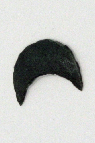 applique in lamina di bronzo a profilo leggermente concavo, di forma semilunata; superficie superiore liscia e lucida, inferiore scabra. Probabilmente destinata a decorare un oggetto di arredo.