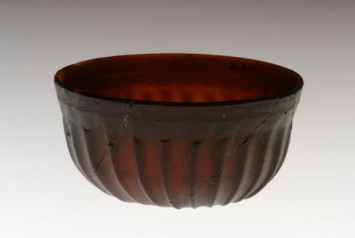 alto labbro leggermente svasato con orlo arrotondato ed appiattito, vasca emisferica con ventotto costolature radiali pronunciate che si assottigliano verso il fondo, tagliate e molate nella parte superiore; fondo piano; all'interno della vasca, una linea incisa sotto l'orlo e due sottili cerchi concentrici.