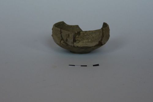 coppa con carena molto arrotondata e orlo diritto sottolineato da due sottili solcature parallele, fondo piano; decorazione alla barbottina costituita da una fila di puntiin racchiusa in due linee continue di probabili foglie molto stilizzate