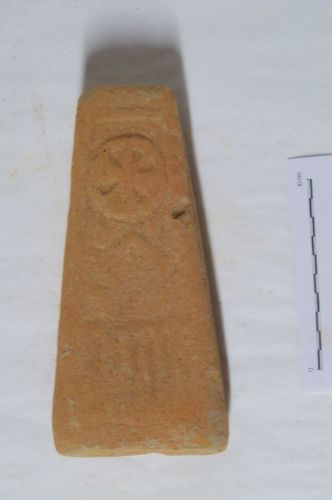 peso da telaio troncopiramidale, con base rettangolare, con faccia anteriore decorata da motivo geometrico costituito da una serie di linee verticali parallele sormontate da un rombo, a sua volta sormontato da una ruota stilizzata, il tutto in una cornice a rilievo