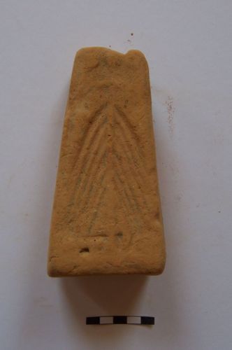 peso da telaio troncopiramidale, con base rettangolare e foro pervio sulla sommità, con faccia anteriore decorata da motivo geometrico non ben leggibile, costituito da una ruota stilizzata e motivi a spina di pesce, il tutto in una cornice a rilievo