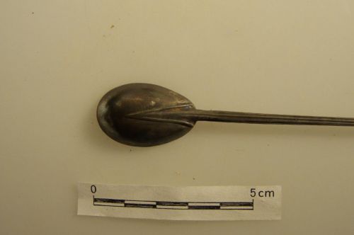 sottile manico a sezione circolare e terminazione assottigliata; vasca ovale poco profonda, decorata all'esterno da una costolatura a V in corrispondenza dell'attacco del manico