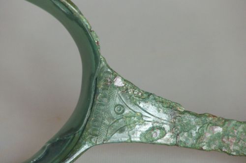 parete cilindrica e orlo leggermente ingrossato; manico leggermente sagomato decorato sulla faccia superiore, all'attacco con la vasca, da un kyma sotto cui sono una fascia a graticcio, un doppio cerchiello e una doppia V campita internamente con sottili linee parallele