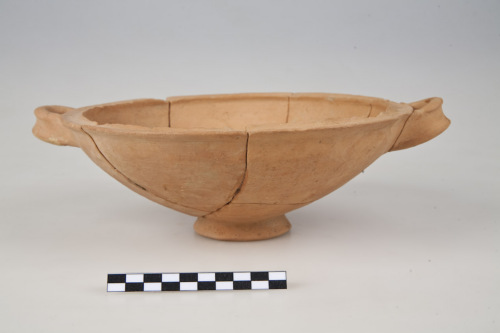Bacile di lekanis in ceramica depurata con orlo arrotondato, assottigliato con battente rettilineo leggermente obliquo verso lalto per la posa del coperchio, ampia vasca troncoconica, piede ad anello obliquo, fondo esterno con umbone appuntito, anse a nastro insellato, applicate orizzontalmente sotto lorlo. L'argilla è di colore arancio molto polverosa.