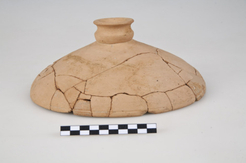 Coperchio di lekanis in ceramica depurata con calotta emisferica con orlo arrotondato, sottolineto da linea orizzontale incisa leggermente, presa cava profilata in due gole alternate da un toro. L'argilla è di colore arancio molto polverosa.
