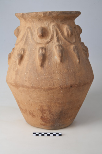 Urna cineraria biconica con orlo svasato verso lesterno e labbro piatto, fondo piatto, decorazione applicata costituita da due fasce sovrapposte: nella parte superiore dellurna, sotto lorlo, fregio a festoni con inserzione di testine femminili; nella fascia inferiore, giro di anforette. La ceramica polverosa è di colore rosa-arancio con grossi, ma rari inclusi bianchi.