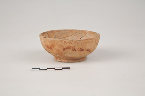 Ciotolina a pareti concave, orlo arrotondato, piede ad anello obliquo, fondo esterno piatto, lieve umbone di tornitura, allinterno della vasca. L'argilla è di colore beige arancio, poche tracce di vernice rosso mattone, opaco.