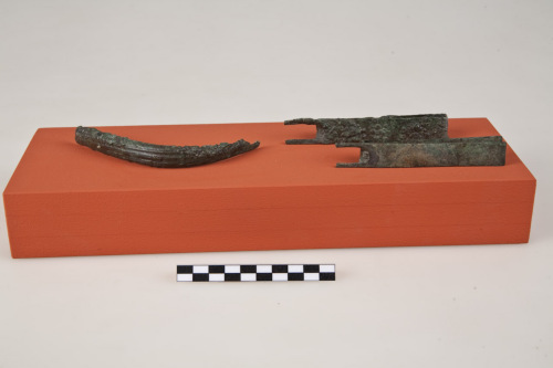 3 frammenti: 1 lama di strigile e 2 manici. Profonda e curva lama (ligula) con costolature mediane; due manici di forma parallelepipeda, allungata, cavi all'interno, con due sottili protuberanze, all'estremità di una faccia, per permettere il fissaggio con la lama.