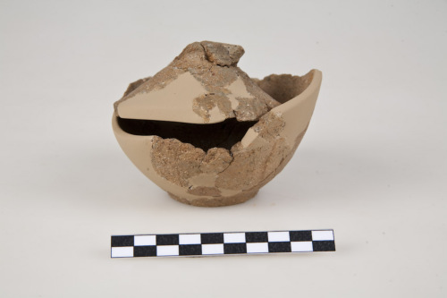 Olla con corpo ovoide e fondo piatto e coperchio a calotta troncoconica e presa a bottone. L'argilla è di colore giallo scuro con numerosi inclusi bianchi e ferrosi.