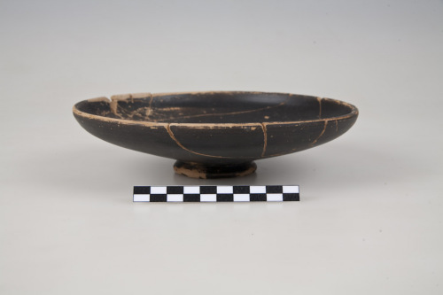 Patera con orlo arrotondato, leggermente obliquo verso linterno, vasca profonda, con pareti a profilo convesso e curvatura in prossimità dell'orlo, piede ad anello troncoconico con profilo angoloso, leggermente arrotondato, fondo esterno del piede con leggero umbone di tornitura. Nella vasca interna, al centro, 3 larghi cerchi concentrici incisi, due più esterni, uno più piccolo, più al centro; decentrato, tracce di disco impresso di impilamento. Sulla parete esterna, nella parte inferiore, tracce di cerchi concentrici incisi. Tracce di impronte digitali in prossimità del piede e sul piede. L'argilla è di colore beige-arancio, la vernice è nero-bruna, opaca, diluita, vernice nero-bruna nel fondo esterno del piede.