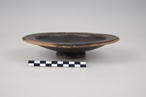 Piatto con labbro a tesa a profilo ondulato (convesso-concavo), orlo appiattito e obliquo verso lesterno, raccordo bordo-vasca quasi verticale, vasca interna poco profonda e leggermente concava, piede troncoconico a profilo arrotondato, fondo esterno con umbone di tornitura. Nella vasca interna, al centro, 4 cerchi concentrici incisi: due più esterni ravvicinati, due in prossimità del centro, distanziati dagli altri, disco d'impilamento bruno, decentrato. Sul labbro nella parte esterna, scanalature circolari. Tracce di impronte digitali in prossimità del piede e sul piede. L'argilla è di colore beige-arancio, la vernice è nero-bruna, opaca, diluita, con chiazze rosso-brune.