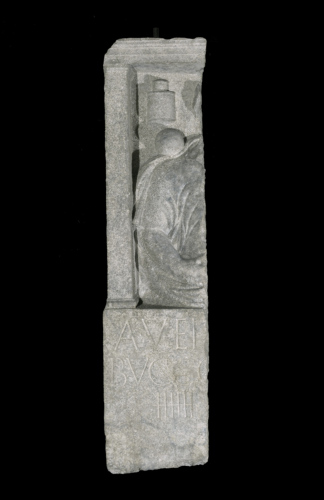 Stele funeraria a edicola, priva di timpano, con pilastrini laterali modanati, sormontati da un piccolo architrave; all'interno è scolpito ad altorilievo il busto di un togato, con due oggetti raffigurati sopra la spalla sinistra, di cui uno di forma sferica, l'altro cilindrica. La parte inferiore della stele presenta un'iscrizione su tre righe. Sbozzato il lato superiore della stele, lavorato a martellina il lato sinistro. La stele è stata segata a metà in funzione del reimpiego come stipite, come confermano i due incassi presenti sul lato posteriore, rifinito anche a gradina; uno è di forma quadrangolare ed è rivestito all'interno con una lamina in ferro, in parte ripiegata; l'altro, presso il margine inferiore è un incasso di forma rettangolare.