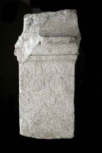 - ISCRIZIONI lato frontale - Spei Aug(ustae)/ C(aius) Cartori/us Acereus/ Cartoria/ Acte/[---] morim/ [---]oriae - C(aius) Cartorius Acereus e Cartoria Acte - lettere capitali apicate - Incisione - Latina