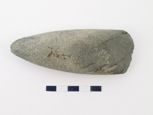 ascia levigata a sezione biconvessa; appare levigata per circa un terzo e picchiettata nella restante porzione; tagliente asimmetrico