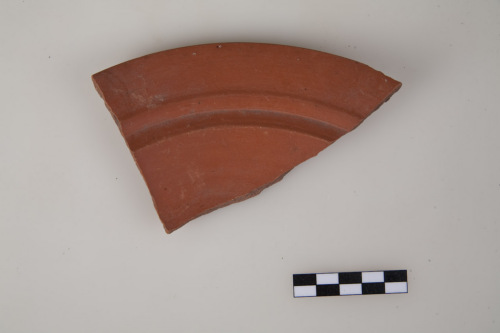 Frammento di patera/scodella in terra sigillata africana D, parete espansa a profilo convesso con fondo della vasca interna piatto, orlo ad andamento spezzato, costituito da due parti: una più esterna con labbro ingrossato a sezione sub triangolare, pendente verso il basso e una più interna unita alla precedente a spigolo vivo, sottolineato da un listello poco rilevato, e avente andamento angolare. Lorlo è unito alla parete a spigolo vivo ed è inclinato verso linterno. L'argilla è di colore arancio-rossastra, la vernice interna ed esterna è rosso-arancione, liscia, opaca.