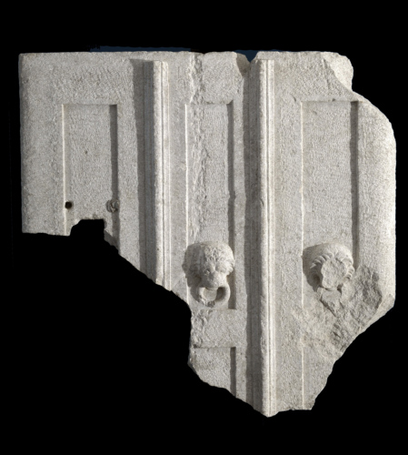 Parte superiore di porta funeraria, interamente rifinita a gradina; tracce di scalpello in alto a destra. La superficie frontale è ripartita in tre riquadri con piano ribassato, separati da due modanature composte da gola rovescia, toro e gola rovescia; nel riquadro centrale e in quello di destra è scolpita ad altorilievo una testa di leone, di cui quella centrale tiene in bocca una maniglia. A sinistra vi è l'incasso per la serratura e l'innesto della maniglia, di cui restano le tracce dell'attacco in piombo. Come si desume dalle tracce rimaste al centro e a destra, una seconda serie di riquadri caratterizzavano la parte inferiore della porta.