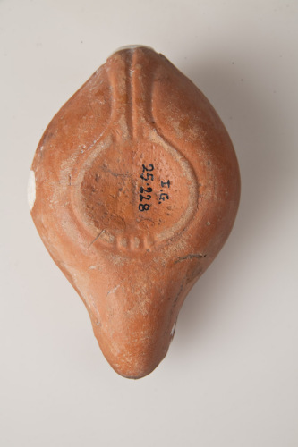 Lucerna a becco allungato con disco di forma ovale e schiacciata, fondo esterno, leggermente concavo, contornato da solcatura, che continua sul serbatoio verso la presa diramandosi in 3 scanalature parallele e trattini verticali sul bordo del fondo, presa verticale, triangolare, piena con solcatura centrale, spalla obliqua decorata da motivo a ramo di palma, a lineette incise, il disco concavo presenta due fori di alimentazione lungo lasse longitudinale, al centro, a rilievo probabile grifone in corsa verso d., tracce di uso sul becco. L'argilla è di colore arancione rosata, la vernice è arancione più scuro.