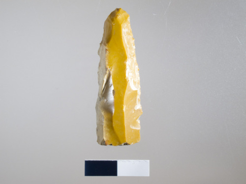 grattatoio carenato a muso su lama; ritocco laterale destro semplice, marginale diretto e parziale; conserva tracce di cortice