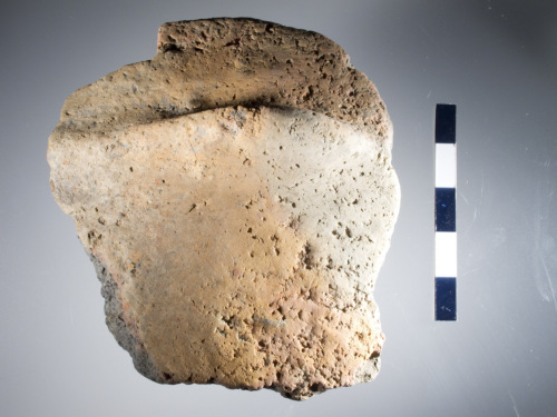 frammento di orlo diritto e labbro arrotondato con presa a linguetta; la linguetta, nella porzione di parete conservata, si assottiglia e prosegue in un cordone liscio