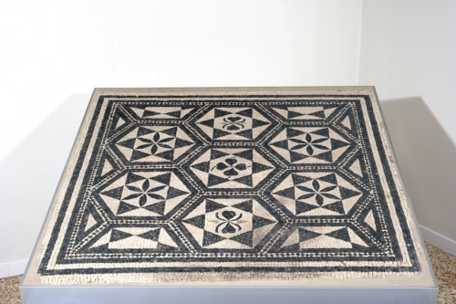 Mosaico a motivi geometrici bianchi e neri, con composizione triassale di stelle a sei punte tangenti, formanti losanghe, con le stelle iscritte negli esagoni di un nido d'ape, nella variante di motivi vegetali neri su fondo bianco inseriti all'interno delle stelle. In alcuni punti sono anche inserite paste vitree.