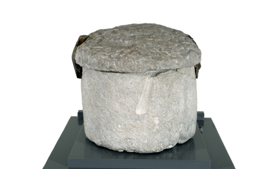 Urna cineraria cilindrica, in pietra tenera di Vicenza, con coperchio in pietra d'Istria; sono ancora presenti le grappe per fissare il coperchio all'urna vera e propria.