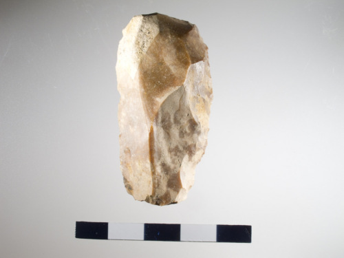 grattatoio frontale lungo a ritocco laterale destro semplice marginale; sulla faccia dorsale e in prossimità della fronte conserva parte del cortice