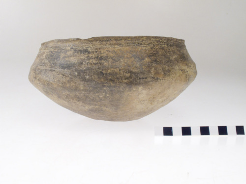 Scodella con profilo a S e fondo ombelicato; labbro arrotondato. La decorazione è costituita da un fascio formato da due solcature poste al di sotto dell'orlo e da un motivo elicoidale sulla carena. Superfici lisciate. Costituiva il coperchio dell'ossuario (incinerazione femminile)