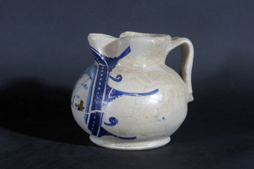 Boccale di forma globulare, con bocca trilobata dal bordo ispessito e versatoio ristretto, larga ansa a nastro impostata a circa metà del collo e appoggiata sul ventre con una terminazione a punta; piede espanso con spigolo smussato. Il corpo ceramico, di impasto compatto e di colore giallo, è ricoperto da uno smalto color grigio perla, visibile fino al piede. La decorazione pittorica, in azzurro scuro, consta di un medaglione ventrale che si estende in posizione frontale fin quasi alla bocca, con all'interno l'albero con vela, sartiame, e parte dell'opera morta (parte di uno scafo) di una nave. Intorno si sviluppa una corona dentata accompagnata da una sequenza di palmette peduncolate con elementi intermedi.