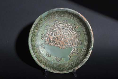 Piatto a cavetto piano con parete curva e orlo esoverso, piede a basso cercine con sezione rettangolare. Il corpo ceramico, di argilla depurata, è ricoperto completamente da ingobbio bianco e vetrina monocroma verde. La decorazione pittorica, in verde, consta di un grande medaglione centrale, con ricca decorazione a festoni, contenente un motivo a racemi su fondo risparmiato; sulla parete, fasce concentriche con motivi ad archetti e a nastro meandriforme; sopra questi, una larga fascia con motivo vegetale stilizzato a foglie, sovrapposte in sequenza.