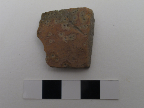 Frammento di ceramica invetriata di un piccolo contenitore di forma chiusa. Presenta una vetrina non coprente e bollosa. Si notano molti vacuoli. La cottura dell'argilla è avvenuta in ambiente ossido-riducente.