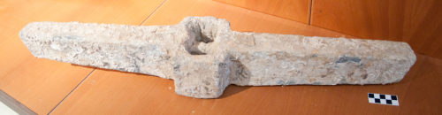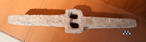 Ceppo d'ancora di tipo fisso con braccia a fusione piena e con perno di fissaggio. La scassa quadrata, presenta un perno di fissaggio posto al centro della scassa stessa.I bracci hanno parte finale poco smussata. Presenta malformazioni di fusione. Forti concrezioni marine non permettono la completa leggibilità del pezzo.