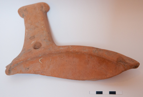 Manico di un tegame, realizzato in ceramica comune depurata di età romana. Si tratta di uno dei ritrovamenti subacquei del Club Subacqueo San Marco di Venezia. Il tegame presenta un impasto rosato molto depurato. La presa è del tipo a nastro a sezione rettangolare, estroflesso e ripiegato alle estremità. E presente un foro passante all'altezza dell'immanicatura, con ogni probabilità usato per appendere il manufatto quando non usato. Il listello superiore è ben delimitato e rifinito ed ha una larghezza complessiva di 1,4 cm. Allesterno la carenatura e segnata da un bordo estroflesso a sezione circolare, anche questo molto ben definito.