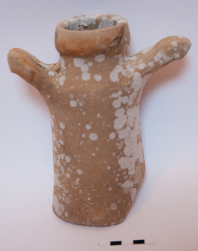 Collo danfora di tipo Forlimpopoli, variante A. Labbro appena arrotondato e leggermente estroflesso. Lattacco delle due anse è sotto il labbro dove è presente una lieve strozzatura. Le anse sono a bastoncello con sezione ellittica schiacciata, con due solcature verticali. Collo piuttosto lungo a sezione cilindrica, con una leggera ingrossa tura a livello dell'attacco delle anse. Impasto nocciola chiaro, depurato con pochissimi inclusi bianchi. Fratture molto levigate da fluitazione in acqua. Tracce abbondanti di calcari marini e sale da deposizione in ambiente acquatico salato.