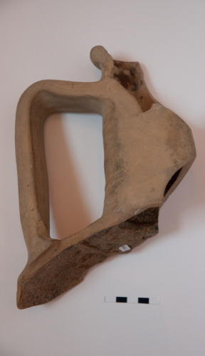 Collo danfora con anse. Il labbro è estroflesso a sezione cilindrica e ad anello. Il collo è troncoconico e si rastrema dolcemente verso la spalla, segnata decisamente da un andamento orizzontale. Lansa è a nastro con profonda solcatura centrale che produce una tipica forma bifida. Sono presenti evidenti schiariture superficiali, e forti i segni del tornio al'interno del collo. Fratture molto levigate da fluitazione in acqua residui di calcare provocati da microrganismi marini durante la permanenza in acqua salata di laguna o mare.