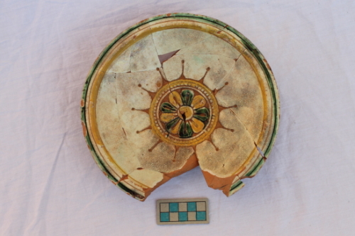 Piatto a profilo tronco-conico, orlo indistinto con breve listello e piede a disco. Il reperto è rivestito solo sulla superficie interna da ingobbio graffito e dipinto sotto vetrina piombifera. Il decoro, graffito a punta e stecca, presenta al centro del cavetto un fiore stilizzato entro un medaglione con motivo "rayonnant à ferroneries". Sul cavetto è visibile il segno lasciato dallo stacco del treppiede di cottura.