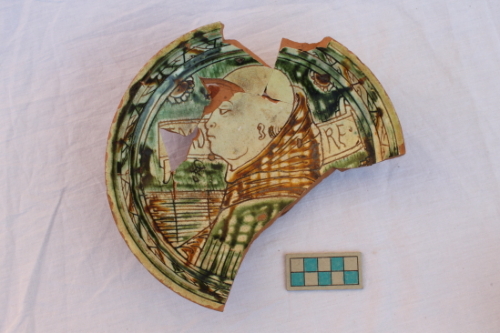 Piatto a profilo tronco-conico con carenatura alta, orlo estroflesso con breve listello e piede a ventosa. La superficie interna è rivestita da ingobbio graffito e dipinto, in giallo e verde, sotto vetrina piombifera, mentre la superficie esterna è parzialmente invetriata. Il decoro graffito è caratterizzato da una cornice a nastro includente la raffigurazione di un frate, di profilo verso sinistra, entro un "hortus conclusus". Ai lati del capo è leggibile su un cartiglio l'iscrizione "[A]MORE". Sul cavetto sono distinguibili i segni lasciati dallo stacco del treppiede di cottura.