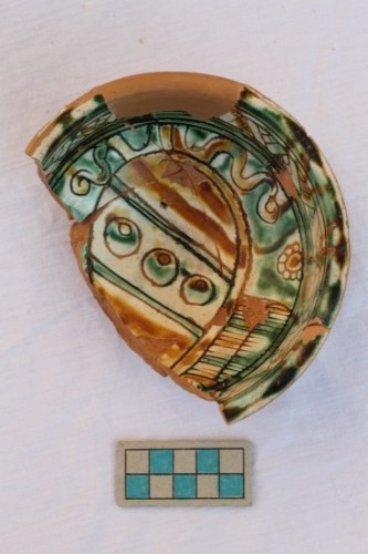 Scodellone con corpo a profilo emisferico, orlo estroflesso e piede a ventosa. Il reperto è rivestito sulla superficie interna, e parzialmente quella esterna, da ingobbio graffito e dipinto sotto vetrina piombifera. Sulla superficie interna è presente sul bordo una cornice ad intreccio, mentre sulla vasca è graffito tra rosette uno stemma entro un "hortus conclusus". Sul cavetto è, inoltre, visibile il segno lasciato dallo stacco del treppiede di cottura. La superficie esterna è caratterizzata da una seguenza di linee oblique e parallele tracciate in modo corsivo e marcate da pennellate di colore giallo e verde.