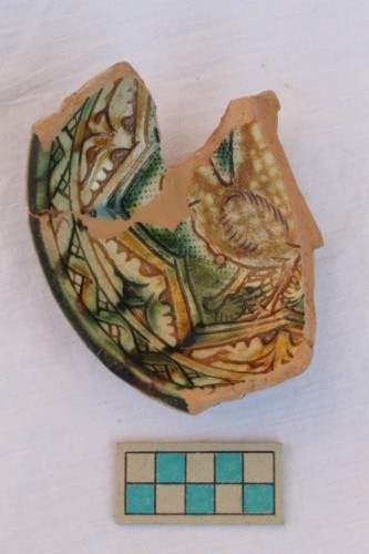 Scodella con corpo a profilo emisferico, orlo estroflesso distinto dalla vasca tramite una nervatura e piede aventosa. Il reperto presenta sia la superficie interna che esterna ingobbiata, graffita e dipinta sotto vetrina. Sotto l'orlo corre una cornice a nastro spezzato; il centro del cavetto è delimitato da una cornice polilobata gotica includente un coniglio accovacciato, rivolto a sinistra, su uno sfondo puntinato e campito da rosette. Lo spazio di risulta tra il nastro ad intreccio e il medaglione è campito da foglie accartocciate. La superficie esterna è decorata da un motivo a squame marcato da pennellate di colore giallo e verde. Sul cavetto sono, inoltre, visibili i segni dello stacco del treppiede di cottura.