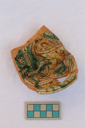 Scodella con corpo emisferiro, orlo estroflesso distinto dalla vasca tramite una nervatura e piede a ventosa. Il reperto è rivestito sia all'interno che all'esterno da ingobbio graffito e dipinto, in giallo e verde, sotto vetrina piombifera. Sotto l'orlo si sviluppa una cornice a nastro spezzato; il cavetto è delimitato da una cornice gotica polilobata includente un volatile, forse una gru sinistroversa tra motivi fitomorfi stilizzati, su sfondo puntinato campito da rosette. Lo spazio di risulta tra la fascia ad intreccio e il medaglione centrale è campito da foglie accartocciate. La superficie esterna reca una campitura a squame marcate da pennellate di colore giallo e verde. Sul cavetto sono visibili i segni lasciati dallo stacco del treppiede di cottura.