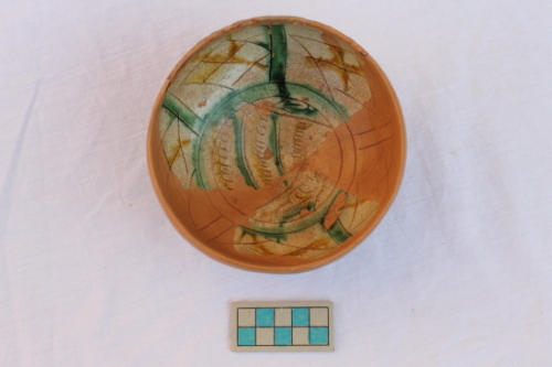 Scodella a profilo emisferico, orlo indistinto e piede ad anello. Il reperto è rivestito uniformemente da ingobbio sulla superficie interna graffita e dipinta in giallo e verde sotto vetrina. Sulle pareti della vasca si svolge una fascia decorata da rombi tagliati in croce entro divisione a quartieri. In corrispondenza del cavetto è presente un medaglione che include un uccello rivolto a destra tra motivi fitmorfi stilizzati. La superficie esterna è coperta parzialmente da ingobbio sotto vetrina.Sul cavetto sono, inoltre, viisibili i segni di stacco del treppiede di cottura.