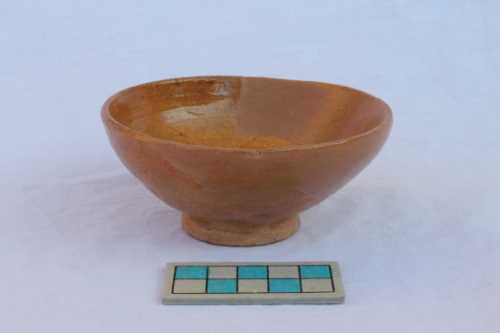 Scodellina con corpo a profilo emisferico, orlo indistinto e piede ad anello. Il reperto è rivestito da vetrina giallastra, uniformemente all'interno e parzialmente all'esterno. Sul cavetto sono visibili i segni lasciati dallo stacco del treppiede di cottura, in corrispondenza dei quali sono presenti tracce di vetrina di colore verde.