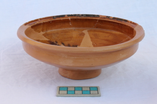 Bacinetto con corpo carenato, orlo verticale con breve tesa a sella e piede ad anello. Il reperto è rivestito uniformemente all'interno e parzialmente all'esterno da vetrina piombifera di colore marrone chiaro. La tesa è marcata da pennellate di color manganese, mentre sul cavetto le pennellate sono organizzate a formare una sequenza di linee orizzontali e parallele, anch'esse, di color manganese.