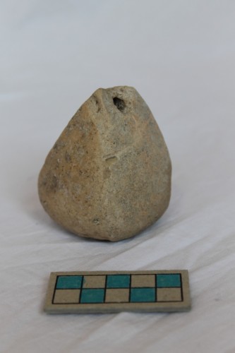 Piccolo peso di forma tronco-piramidale arrotondata, caratterizzato alla sommità da un foro circolare passante funzionale alla sua sospensione sul telaio.